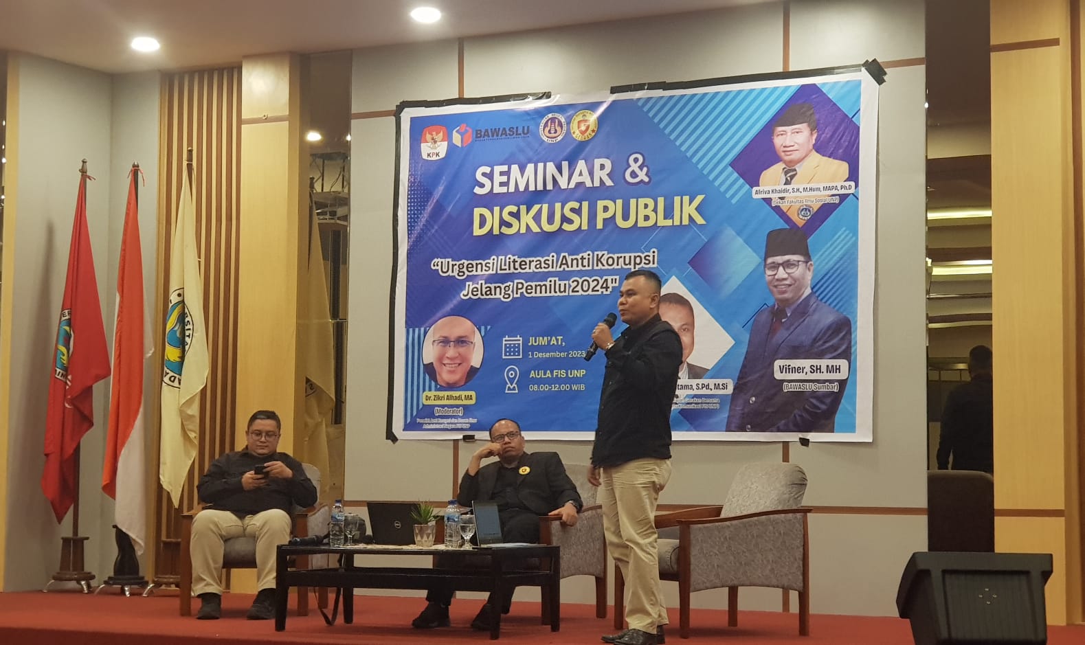 Langgam.id – Pusat Kajian Gerakan Bersama Antikorupsi (Gebrak) Universitas Negeri Padang (UNP) bekerjasama dengan Komisi Pemberantasan Korupsi (KPK) dan Badan Pengawas Pemilu (Bawaslu) Sumbar, menggelar Seminar dan Diskusi Publik dengan tema Urgensi Literasi Anti Korupsi Jelang Pemilu 2024.