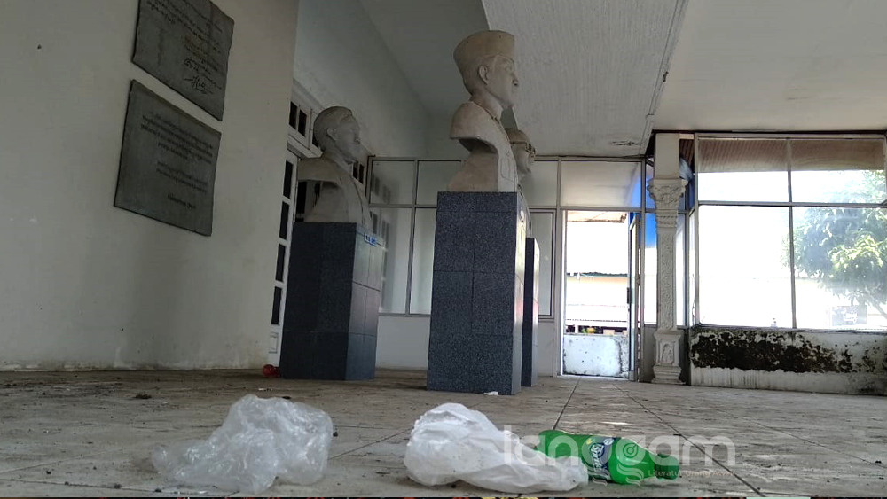 Sampah plastik tampak berserakan di teras bangunan. Sampah plastik itu berada tak jauh dari patung bapak proklamator Indonesia Soekarno dan Mohammad Hatta serta Muhammad Sjafei.