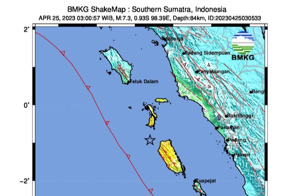 Dalam rilis BMKG, pusat gempa koordinat 0,93 Lintang Selatan dan 98,39 Bujur Timur. Kedalaman 84 kilometer.