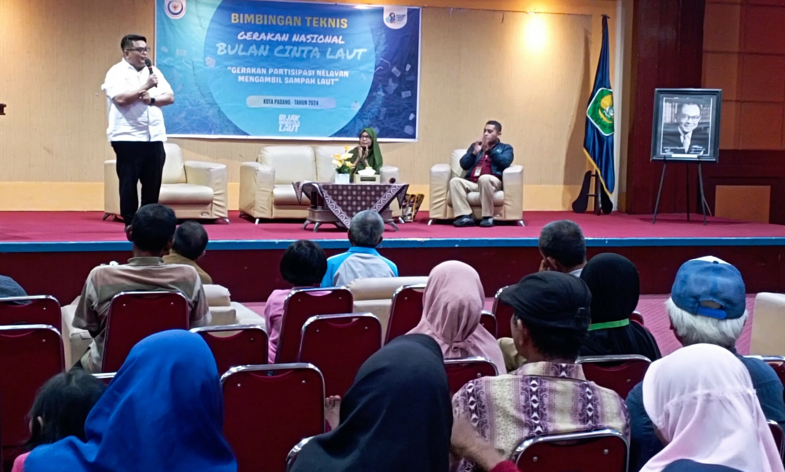 Langgam.id – Puluhan nelayan dari Kelurahan Ulak Karang Utara, Ulak Karang Selatan, dan Kelurahan Flamboyan antusias mengikuti bimbingan teknis (bimtek) Gerakan Nasional Bulan Cinta Laut di Aula Balairung Caraka, Kampus I Universitas Bung Hatta.