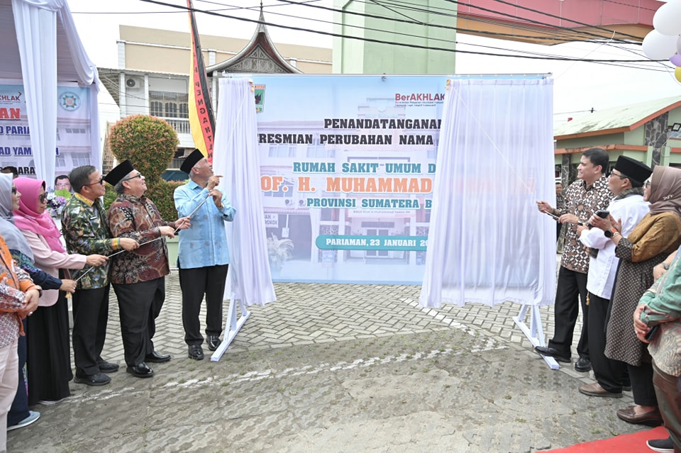 Dalam acara peresmian, Gubernur Mahyeldi juga menandatangani prasasti perubahan nama RSUD Pariaman menjadi RSUD Prof. H. Muhammad Yamin, SH, bersama dengan fasilitas pendukung lainnya. Ia berharap, kehadiran nama baru ini menjadi semangat bagi seluruh pihak untuk menjadikan RSUD tersebut sebagai pusat pelayanan kesehatan yang membanggakan.
