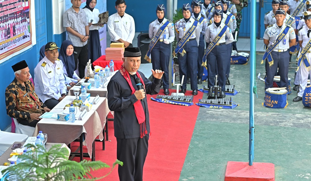 Langgam.id – Gubernur Sumatera Barat (Sumbar) Mahyeldi Ansharullah memotivasi siswa-siswi baru SMK Pelayaran Padang dalam kegiatan upacara pembukaan Masa Pengenalan Lingkungan Sekolah (MPLS) di Padang, Sabtu (27/7/2024).