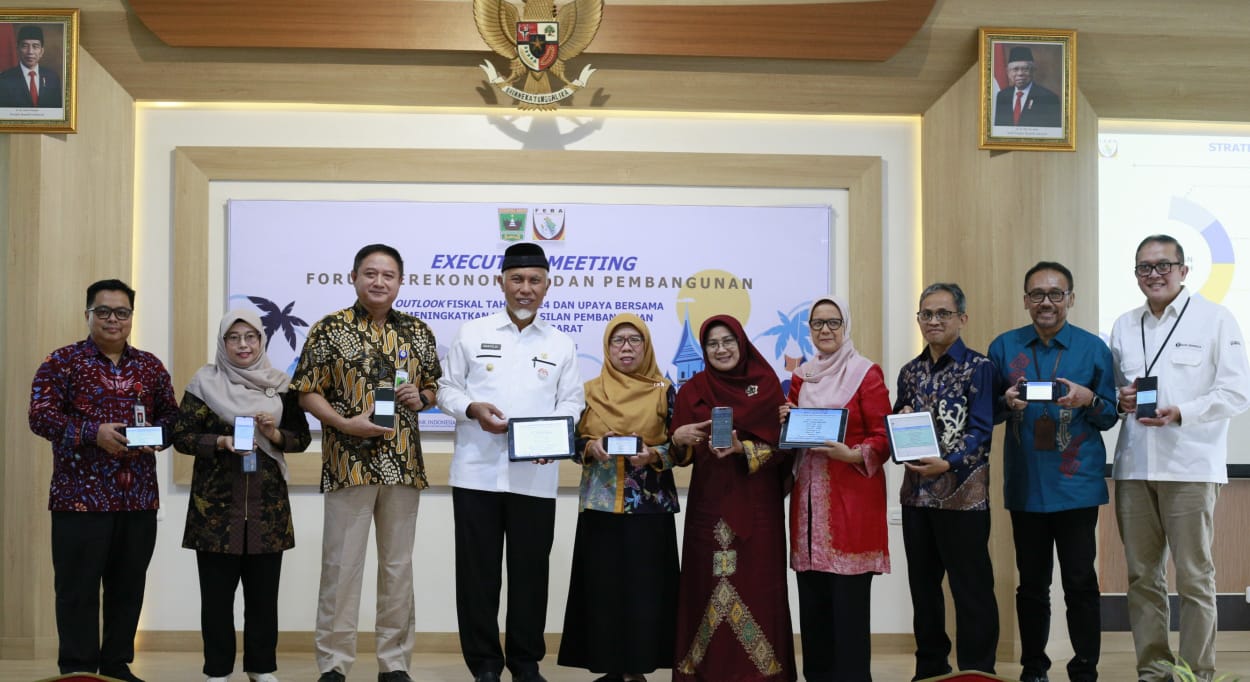 Gubernur Mahyeldi bersama pimpinan tim FEBA Sumbar kemudian melakukan sesi foto bersama dengan menunjukkan bukti penerimaan elektronik SPT Tahunan Orang Pribadi.