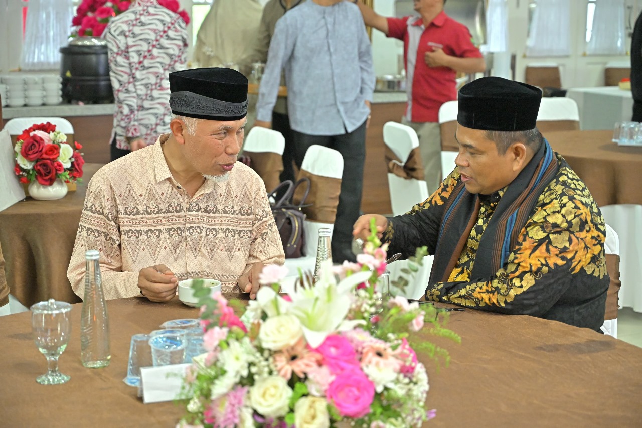 Gubernur Mahyeldi menyampaikan bahwa momentum perayaan Idul Fitri tahun ini menjadi momen penting untuk memperkuat silaturahmi dan Ukhuwah Islamiyah dengan seluruh elemen masyarakat, termasuk dengan para bupati dan walikota.