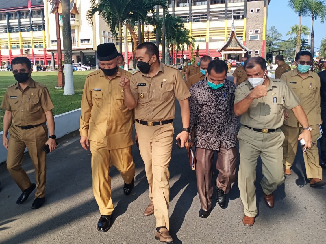 Gubernur Sumbar Mahyeldi dan Wagub Audy Joinaldy berjalan kaki menuju Mapolda Sumbar. (foto: Humas Pemprov Sumbar)