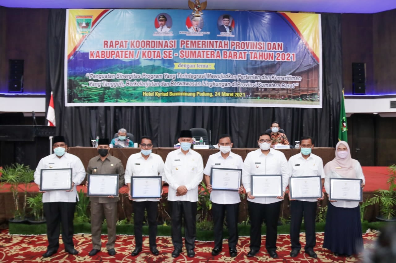 Penyerahan dilakukan saat rapat koordinasi (rakor) Pemprov Sumbar dengan kabupaten/kota di Hotel Kryad Bumi Minang, Padang, Rabu (24/3/2021).
