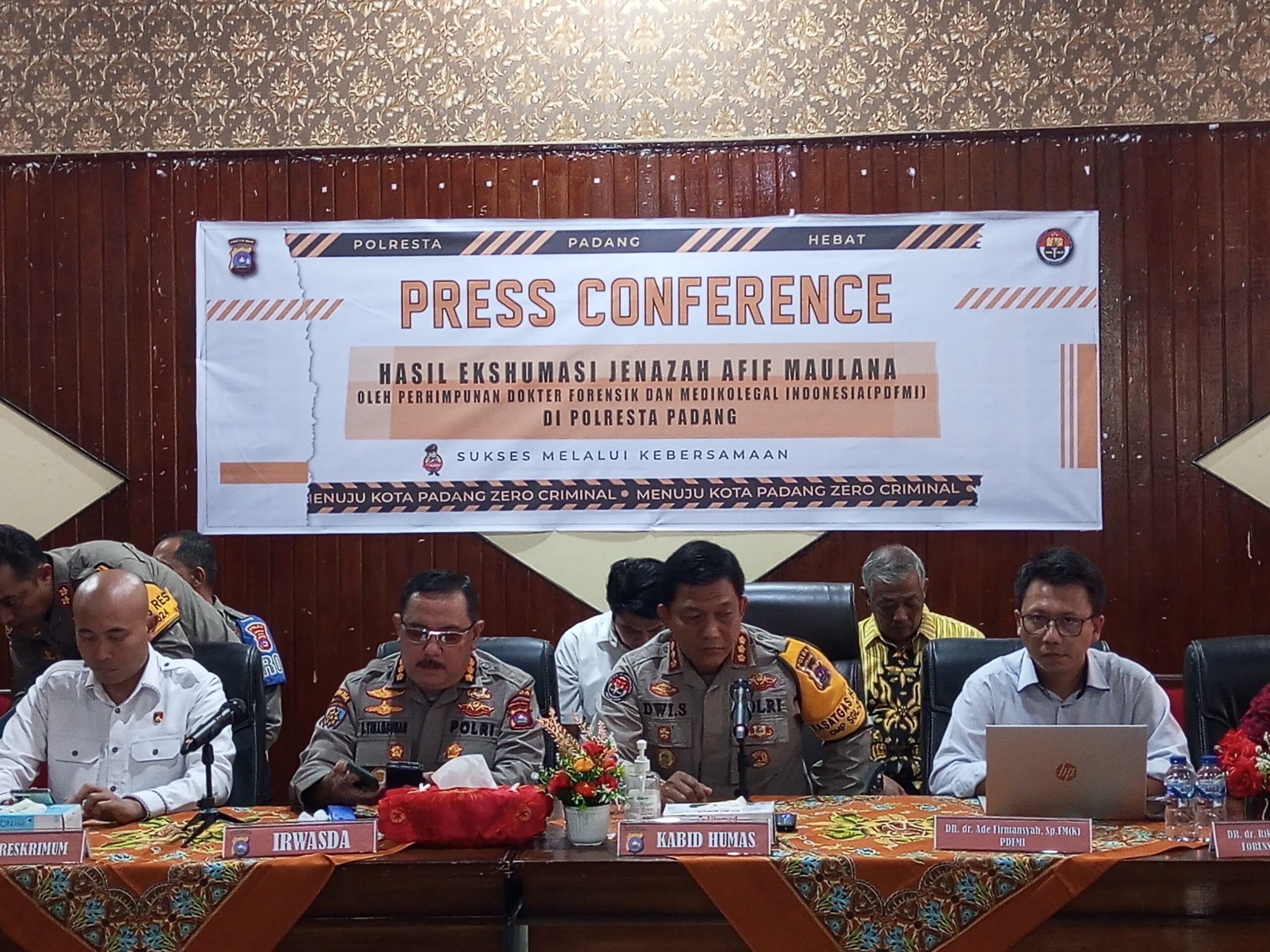 Langgam.id – Perhimpunan Dokter Forensik dan Medikolegal Indonesia (PDFMI) akhirnya mengumumkan hasil ekshumasi jenazah Afif Maulana (13), yang ditemukan tewas di bawah jembatan Batang Kuranji, Kelurahan Pasar Ambacang, Kecamatan Kuranji, Kota Padang. Konferensi pers tersebut digelar di Mapolresta Padang, Rabu (25/9/2024). Sebelumnya, ekshumasi telah dilakukan pada Kamis (8/8/2024) satu setengah bulan lalu.