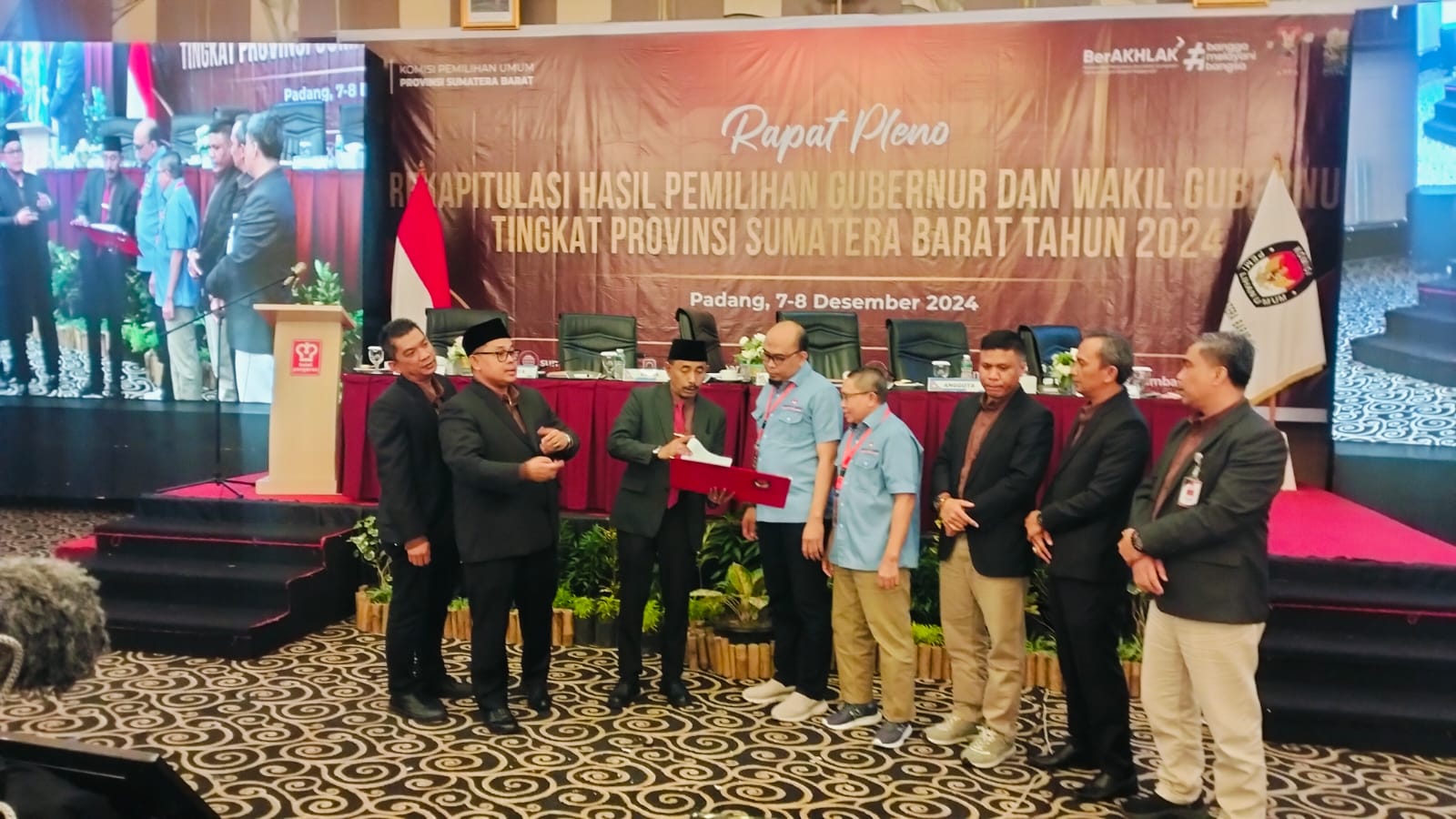 “Menetapkan hasil Pemilihan Gubernur dan Wakil Gubernur Provinsi Sumatera Barat Tahun 2024. Berita acara dan sertifikat rekapitulasi hasil ini kami tandatangani, meski tanpa kehadiran saksi dari Pasangan Calon nomor urut 2, yang sejak hari pertama rekapitulasi memang tidak hadir,” ujar Ketua KPU Sumbar, Surya Efitrimen, Minggu (8/12/2024).