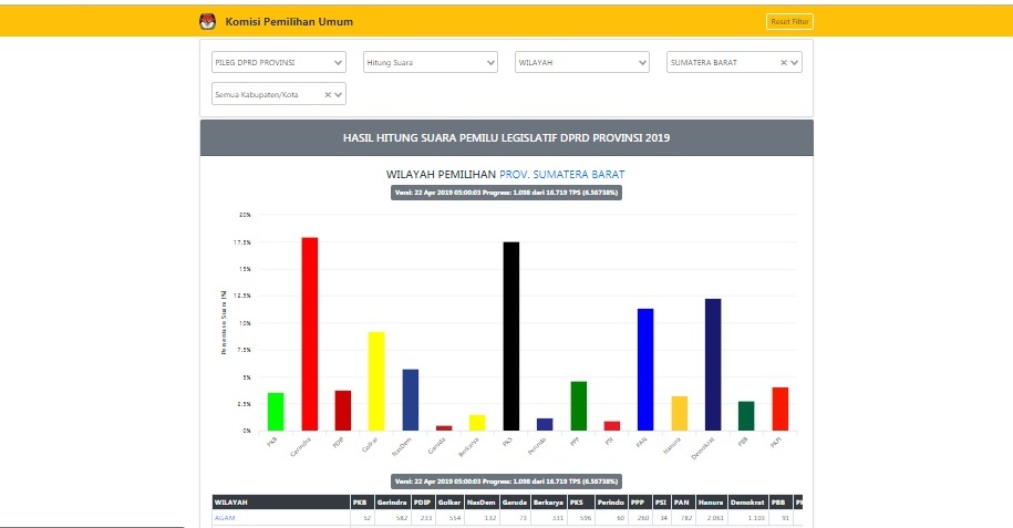 Sampai pukul 05.00 WIB Senin (22/4/2019), suara sudah masuk dari 1.098 TPS (6.56738%) dari total 16.719 jumlah TPS di Sumatra Barat.