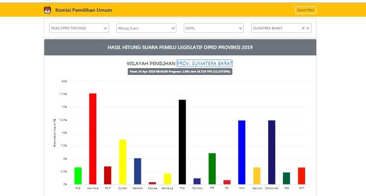 Langgam.id – Hingga pukul 09.00 WIB, Rabu (24/4/2019), hitung suara resmi untuk kursi DPRD Sumatra Barat di situs KPU sudah masuk dari 2.063 TPS (12.33925%) dari total 16.719 TPS.