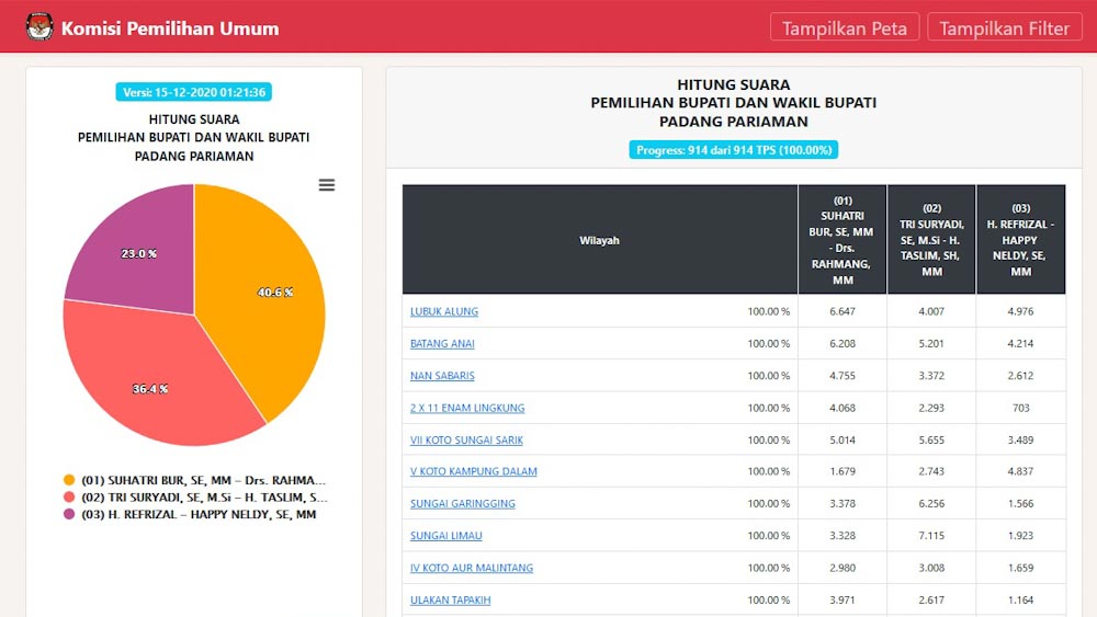 Dalam menu hitung suara yang diunggah di https://pilkada2020.kpu.go.id pasangan ini memperoleh 64.301 suara. Data tersebut dari total 914 tempat pemungutan suara (TPS) di Kabupaten Padang Pariaman. Data TPS terakhir masuk pada pukul 01.21 WIB, Selasa (15/12/2020).