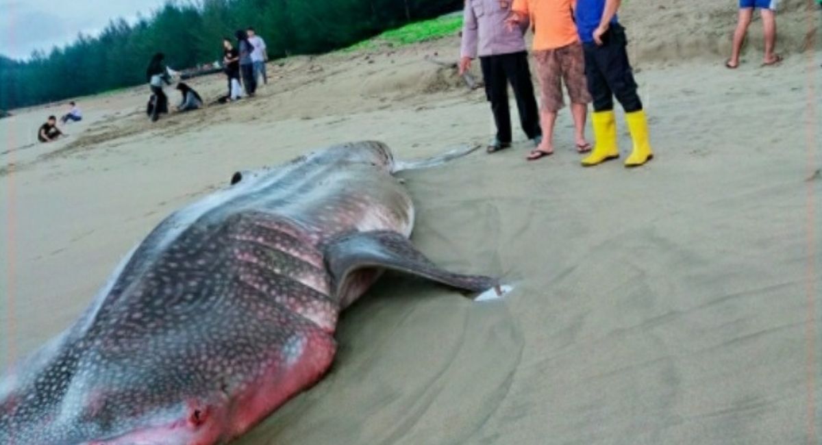 Hiu tutul (hiu paus) terdampar di Pantai Kincir Salido Kabupaten Pesisir Selatan. [Foto: Dok. Polsek IV Jurai]