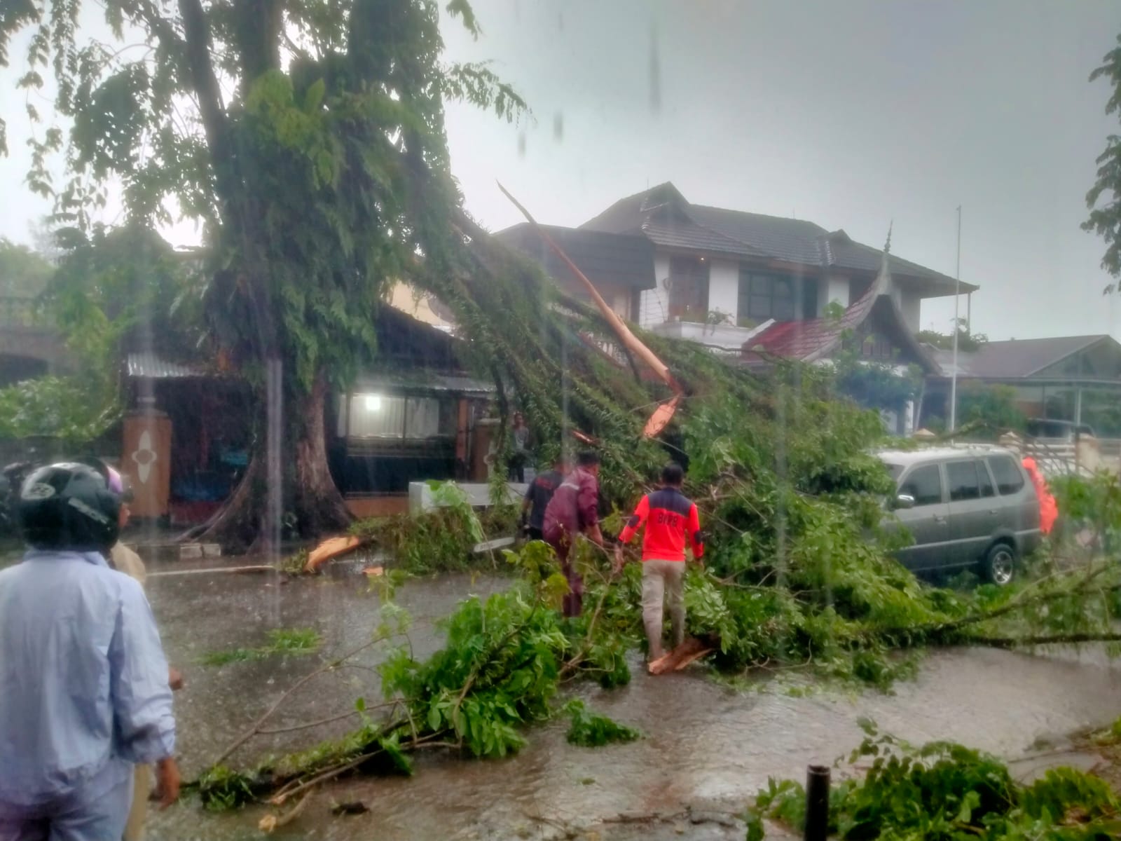 Dampak dari pohon tumbang menyebabkan badan jalan tertutup dan menimpa satu unit mobil sehingga menghambat akses jalan.