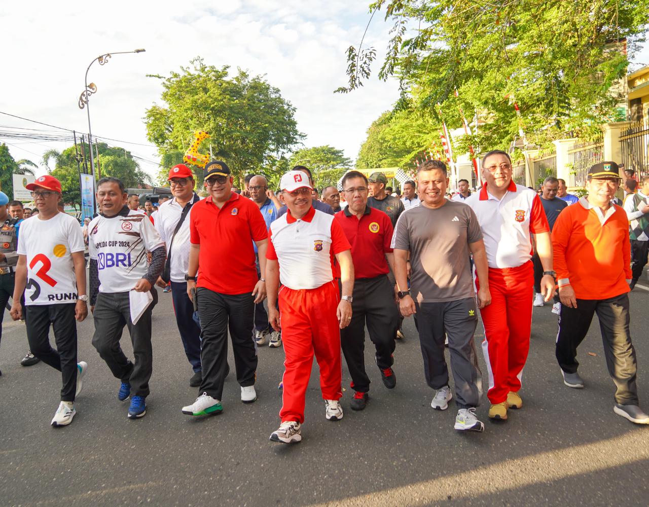 Terlihat Kapolda Sumatera Barat bersama sejumlah Forkopimda Provinsi Sumatera Barat dan Kota Padang mengikuti jalan santai pada rute yang telah ditentukan bersama ribuan warga, dan finis kembali di halaman Kantor Polda Sumbar.