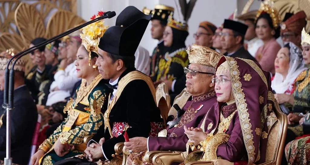 Langgam.id – Wakil Presiden Republik Indonesia Ma’ruf Amin beserta sang istri, Wury Ma’ruf mengenakan pakaian adat Minang saat mengikuti peringatan detik-detik proklamasi kemerdekaan republik Indonesia di halaman Istana merdeka, Jakarta, Kamis (17/8/2023).