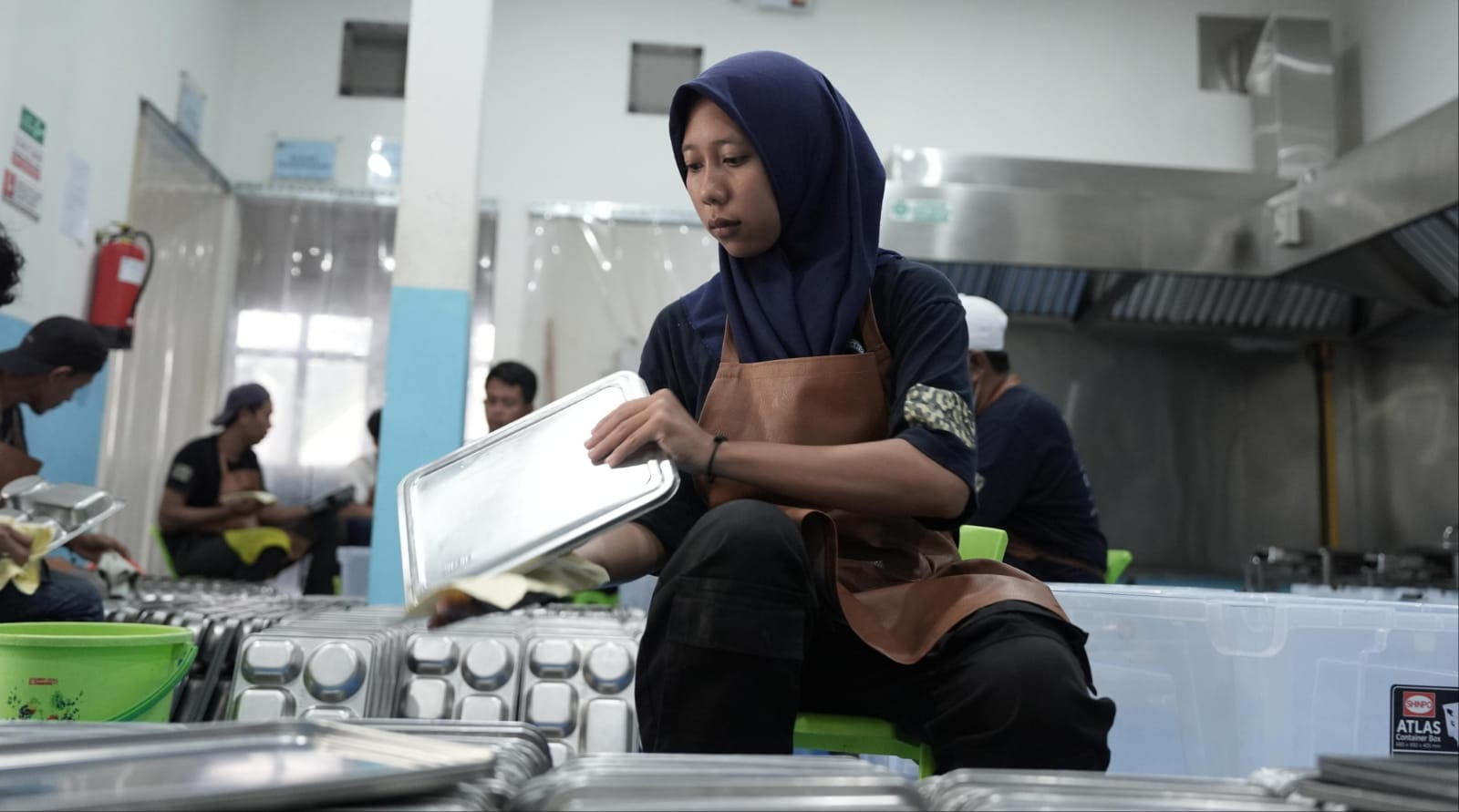 Bersama 13 rekannya, ia membagi tugas, yaitu memisahkan sisa makanan, mencuci, lalu mensterilkan sekitar 3.300 ompreng setiap harinya.