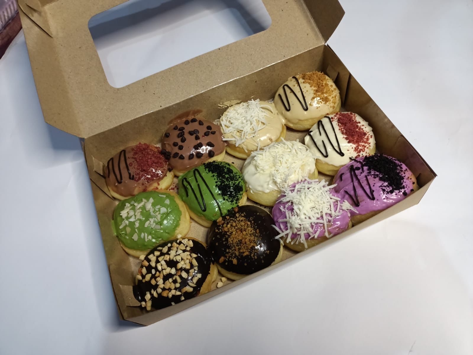 Setelah itu, baluri donat dengan berbagai rasa sesuai pesanan pelanggan. Seperti coklat, tiramisu, matcha, taro, dan tambahan toping sesuai selera.