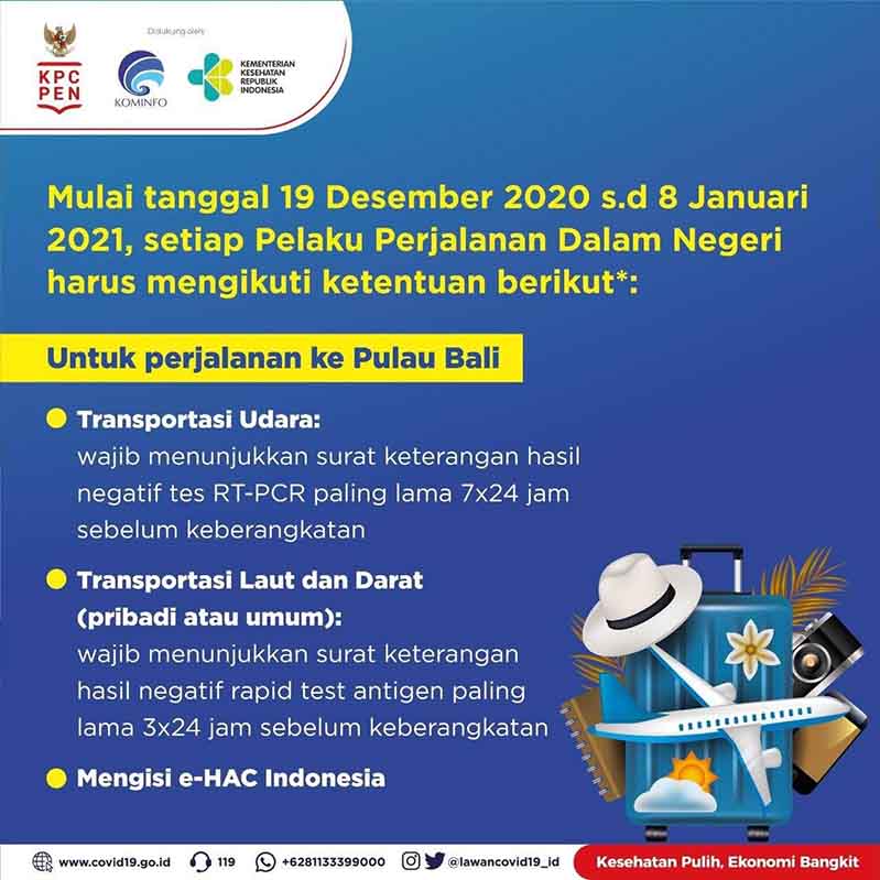 Surat Edaran ini memuat berbagai ketentuan, terutama kewajiban pelaku perjalanan menunjukkan surat keterangan negatif hasil tes RT-PCR atau rapid test Antigen untuk berbagai moda transportasi, baik melalui transportasi udara, darat dan laut, untuk perjalanan ke Pulau Bali, serta dari – , ke – , dan di dalam Pulau Jawa.