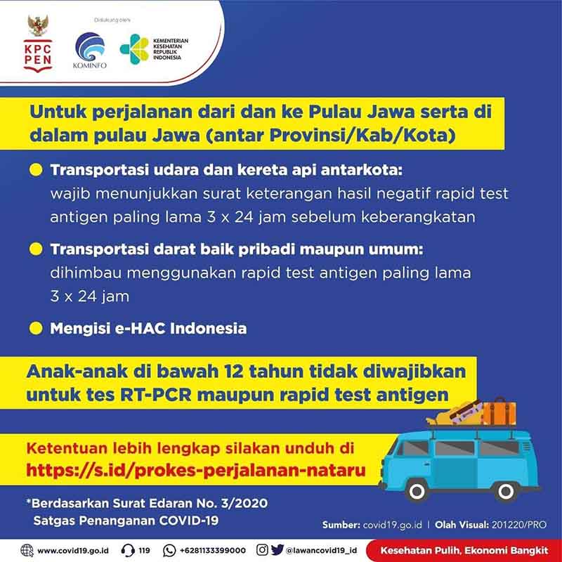 Ketentuan terkait hal tersebut dapat dilihat pada infografis di atas atau diunduh pada tautan https://s.id/prokes-perjalanan-nataru.