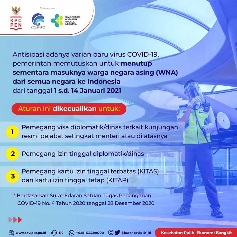 Pemerintah memutuskan untuk menutup sementara masuknya Warga Negara Asing (WNA) ke Indonesia sebagai upaya pencegahan, mulai tanggal 1 Januari s.d. 4 Januari 2021