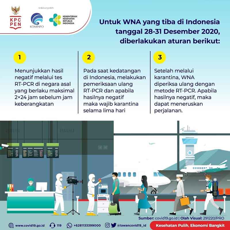 Untuk WNA yang masuk sebelum tanggal 1 Januari 2021, wajib menyertakan bukti hasil negatif tes RT-PCR di negaranya, melakukan pemeriksaan ulang saat tiba di Indonesia dan menjalani karantina selama 5 hari.