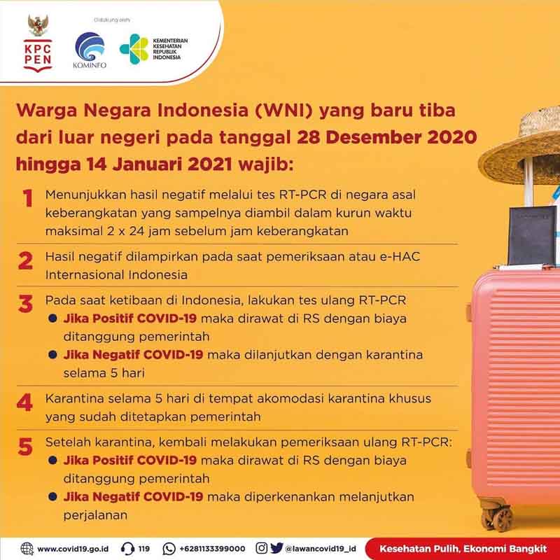 Ketentuan tersebut antara lain: menyertakan hasil negatif tes RT-PCR yang sampelnya diambil 2×24 jam di negara asal sebelum keberangkatan, melakukan tes RT-PCR saat tiba di Indonesia, dan juga melakukan karantina selama 5 hari jika hasil tes dinyatakan negatif.