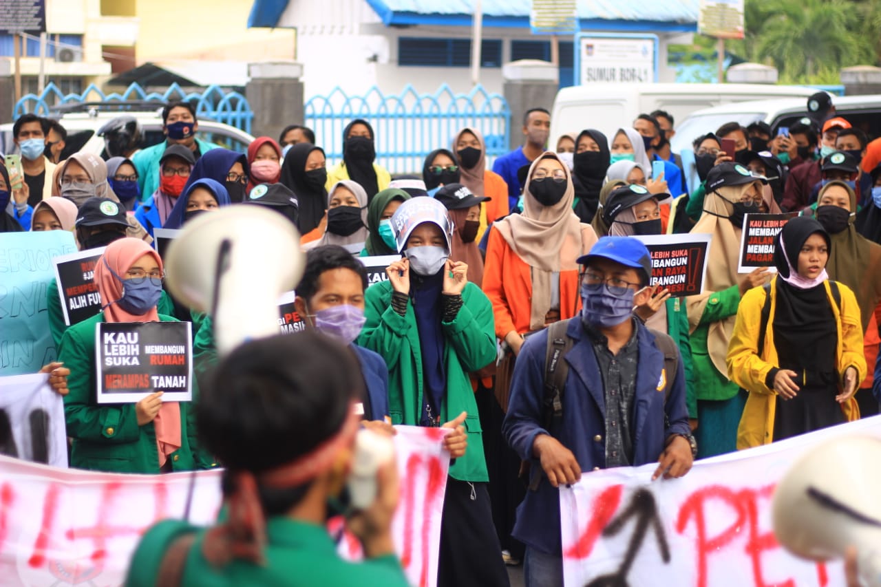 “Petani pasrah, pemerintah serakah. Kau lebih suka membangun rumah, merampas tanah. RUU Cipta Kerja jangan disahkan, memperburuk alih fungsi lahan,” begitu tulisan di beberapa spanduk yang dibawa para mahasiswa.