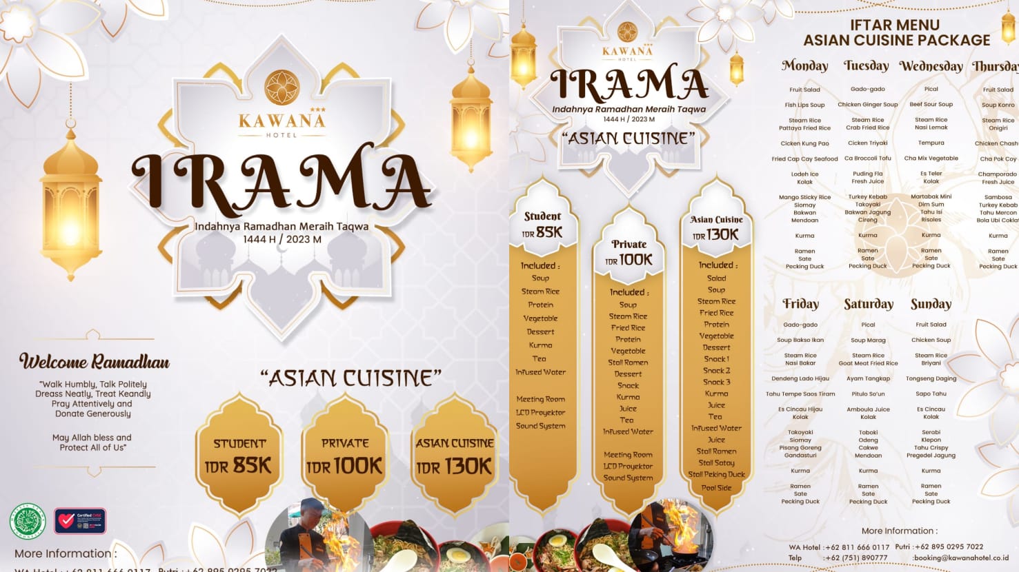 LanggamInfo – Kawana Hotel merupakan hotel bintang tiga yang berlokasi di Jl. MH. Thamrin No. 71, Kota Padang, Sumatera Barat. Bulan Suci Ramadhan selalu menjadi bulan yang paling dinanti-nanti oleh umat Muslim di seluruh dunia. Ramadhan biasanya dijadikan momen untuk berkumpul bersama keluarga, terutama waktu buka puasa bersama. pada Ramadhan kali ini Kawana Hotel Padang menghadirkan paket untuk berbuka yaitu Irama (Indahnya Ramadhan Meraih Taqwa) dengan tema menu Asian Cuisine, Kawana Hotel siap memberikan sajian terbaik dan pastinya memanjakan lidah penikmat kuliner.