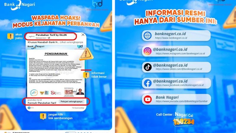 Sebagai langkah preventif, Gusti juga mengimbau masyarakat untuk selalu mengakses informasi resmi melalui situs www.banknagari.co.id, akun Instagram @banknagari.co.id, serta layanan Nagari Call.