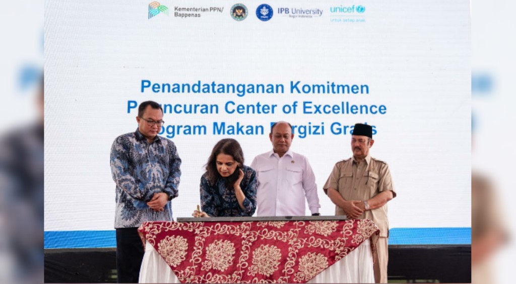Rektor IPB University Arif Satria menyampaikan apresiasinya atas kepercayaan yang diberikan Kementerian PPN/Bappenas, BGN, dan UNICEF menjadikan IPB sebagai NCoE MBG. IPB University akan mengoptimalkan mobilisasi dosen sebagai peneliti, pelatih, dan inovator, serta pengembangan dan pemanfaatan fasilitas di laboratorium fakultas, departemen, dan pusat-pusat studi untuk menyukseskan MBG. IPB University juga siap bekerja sama dengan berbagai pihak dalam membangun ekosistem penyediaan pangan, termasuk dengan Bumdes, koperasi, dan kelompok tani.