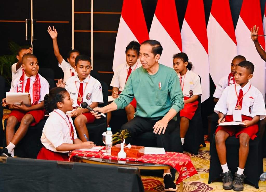Langgam.id – Presiden Joko Widodo bertemu dengan anak-anak pelajar Papua di Ballroom Cendrawasih, Swiss-Belhotel, Kota Jayapura, Provinsi Papua pada Jumat, 7 Juli 2023. Dalam kesempatan tersebut, Presiden Jokowi memberikan kuis matematika berhadiah sepeda.