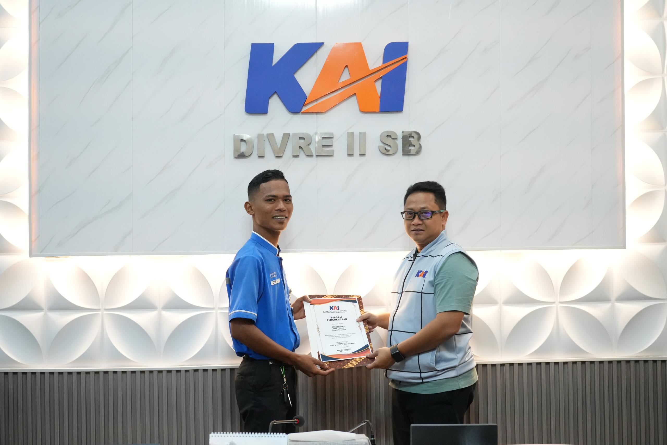 Atas aksi tersebut, Vice President KAI Divre II Sumbar, Muh. Tri Setyawan memberikan piagam penghargaan kepada yang bersangkutan sebagai bentuk apresiasi perusahaan terhadap pekerja di lingkungan Divre II Sumbar yang memiliki nilai kemanusian dan kepedulian yang tinggi terhadap perusahaan, masyarakat dan lingkungan sekitar, Jum’at (25/4) di Ruang Rapat Buya Hamka Kantor KAI Divre II Sumbar.