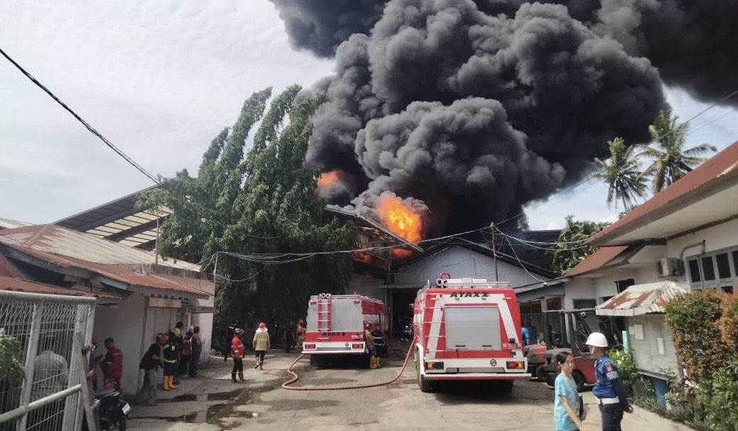 Api masih membakar dua gudang yang dipenuhi karet hingga pukul 14.40 WIB. Kebakaran ini diketahui terjadi sejak pukul 12.00 WIB.