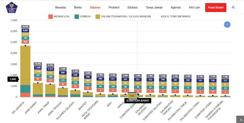 Berdasar data situs resmi Gugus Tugas Nasional covid19.go.id, banyak kasus di Sumbar berada di peringkat 10 secara nasional dan nomor satu di Sumatra. Dengan 221 kasus, jumlah kasus di Sumbar 1,8 persen dari total 12.071 kasus positif yang terkonfirmasi di Indonesia. DKI Jakarta masih yang tertinggi di Indonesia dengan total 4.687 kasus (38,8 persen). Disusul Jawa Barat, Jawa Timur, Jawa Tengah, Sulawesi Selatan, Nusa Tenggara Barat, Bali dan Papua.