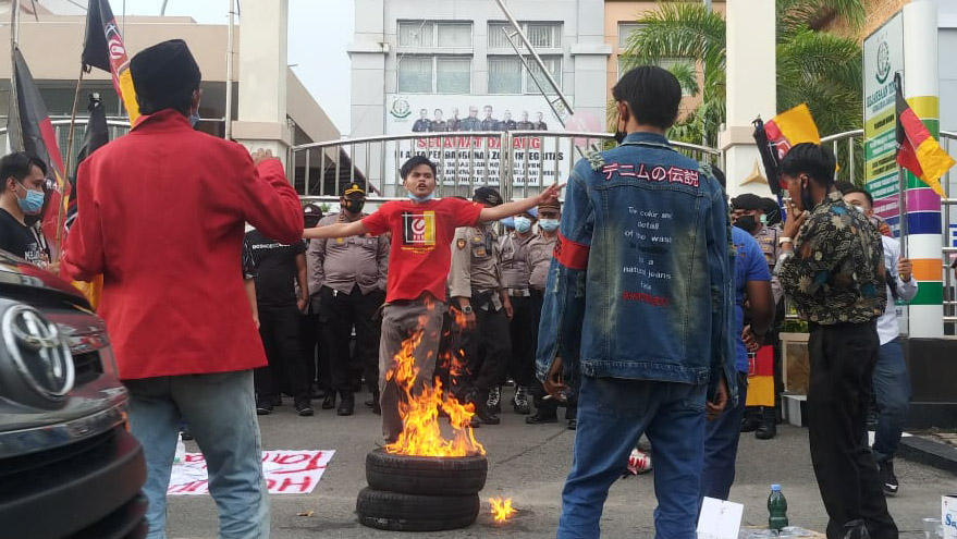 Langgam.id – Belasan mahasiswa melakukan unjuk rasa di Kantor Kejaksaan Tinggi Sumatra Barat (Sumbar), Jumat (9/4/2021) sore. Mahasiswa yang tergabung dalam Pergerakan Milenial Minang (PMM) ini meminta pihak kejaksaan terlibat aktif mengusut dugaan penyelewengan dana covid-19.