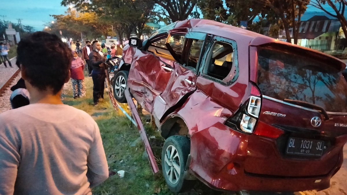 Hantaman kereta api ini membuat minibus merek Toyota Avanza BL 1031 SL itu terseret. Bahkan, akibat Kecelakaan ini minibus naik ke pagar pembatasan rel di sisi trotoar.