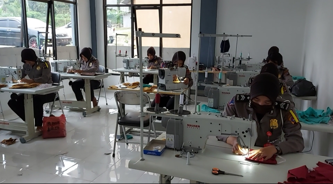 Langgam.id – Sejumlah polisi wanita (Polwan) duduk berjarak di kursi sebuah ruangan. Terdengar suara mesin jahit bersahutan seperti berirama. Dengan raut serius, tangan-tangan gemulai srikandi ini tampak cekatan mengendalikan mesin jahit yang seragam berwarna putih.