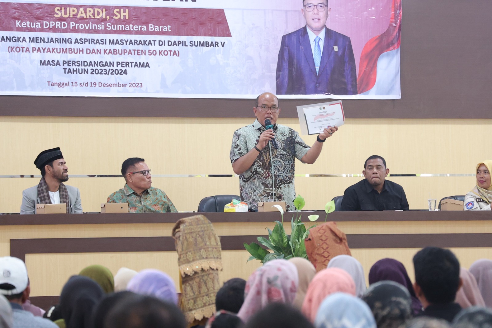 Hal ini disampaikan Ketua DPRD Sumbar Supardi saat memberikan sambutan ekspos hasil penyusunan data base keberbakatan olahraga di Kota Payakumbuh di sela reses anggota DPRD Provinsi Sumatera ke daerah pemilihan Kota, di Aula SMA N 2 Kota Payakumbuh, beberapa waktu lalu.
