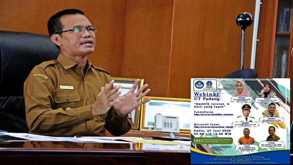 Langgam.id – Dalam merekrut mahasiswa baru, Universitas Terbuka (UT) Padang mengundang Walikota Pariaman Genius Umar sebagai salah satu narasumber dalam Webinar melalui aplikasi zoom secara virtual melalui video conference (vidcon).