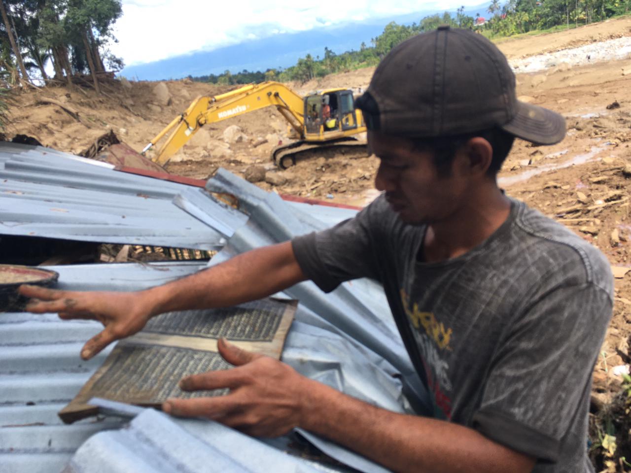 Ia membalikkan beberapa halaman kemudian membentangkannya di atas sebuah puing atap seng yang bersih dari lumpur sisa galodo. Al-Qur’an yang tidak memiliki sampul itu dijemur agar kering segera.