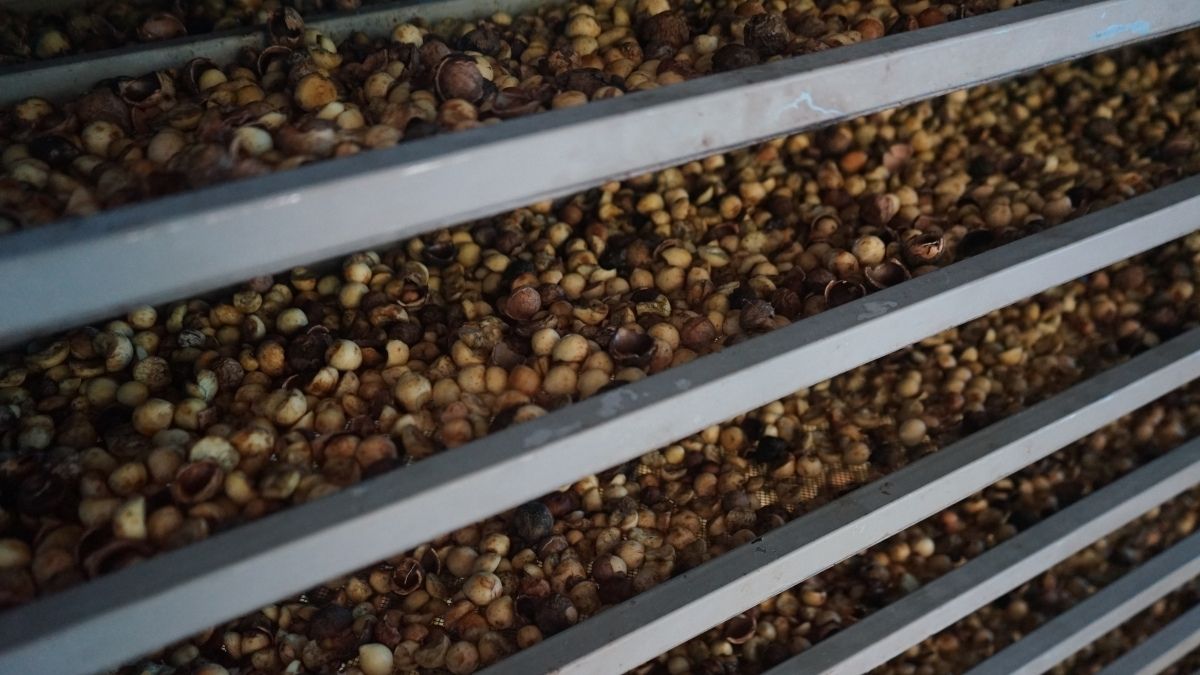 Di Desa Patutrejo, suara deru mesin pemecah biji nyamplung kering sungguh memekakkan telinga– meraung-raung tanpa henti. Semburan partikel debu halus dari lubang buangan mesin, membuat mata perih. Dari kejauhan, Barino [49 tahun] cuma tersenyum sambil mengawasi dua pekerjanya. Pagi itu, berkuintal-kuintal biji nyamplung kering dipecah dengan mesin, lalu di pilah secara manual, sampai bersih dari kulitnya. Tetap saja, butuh ketelatenan tangan manusia untuk membersihkan biji dari kulitnya.