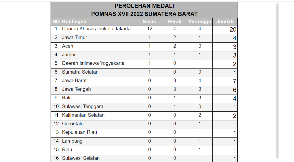 Situs resmi Kemendikbud merilis, DKI Jakarta sementara memperoleh 12 emas, 4 perak dan 4 perunggu dalam Pomnas yang digelar di Padang, Sumatra Barat ini.