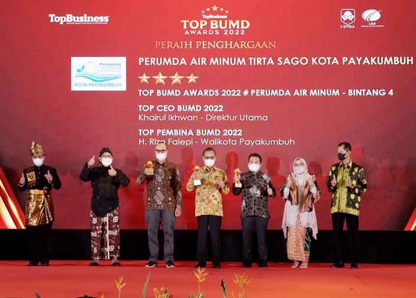 Langgam.id – Pemerintah Kota (Pemko) Payakumbuh memboyong tiga penghargaan bergengsi di ajang TOP BUMD Awards 2022. Penghargaan itu diraih oleh Wali Kota Riza Falepi sebagai TOP Pembina BUMD, lalu ada Direktur Utama Perusahaan Umum Daerah (Perumda) Tirta Sago Kota Payakumbuh, Khairul Ikhwan sebagai Top CEO BUMD, dan Perumda Tirta Sago yang meraih TOP BUMD 2022 Perumda Bintang 4.