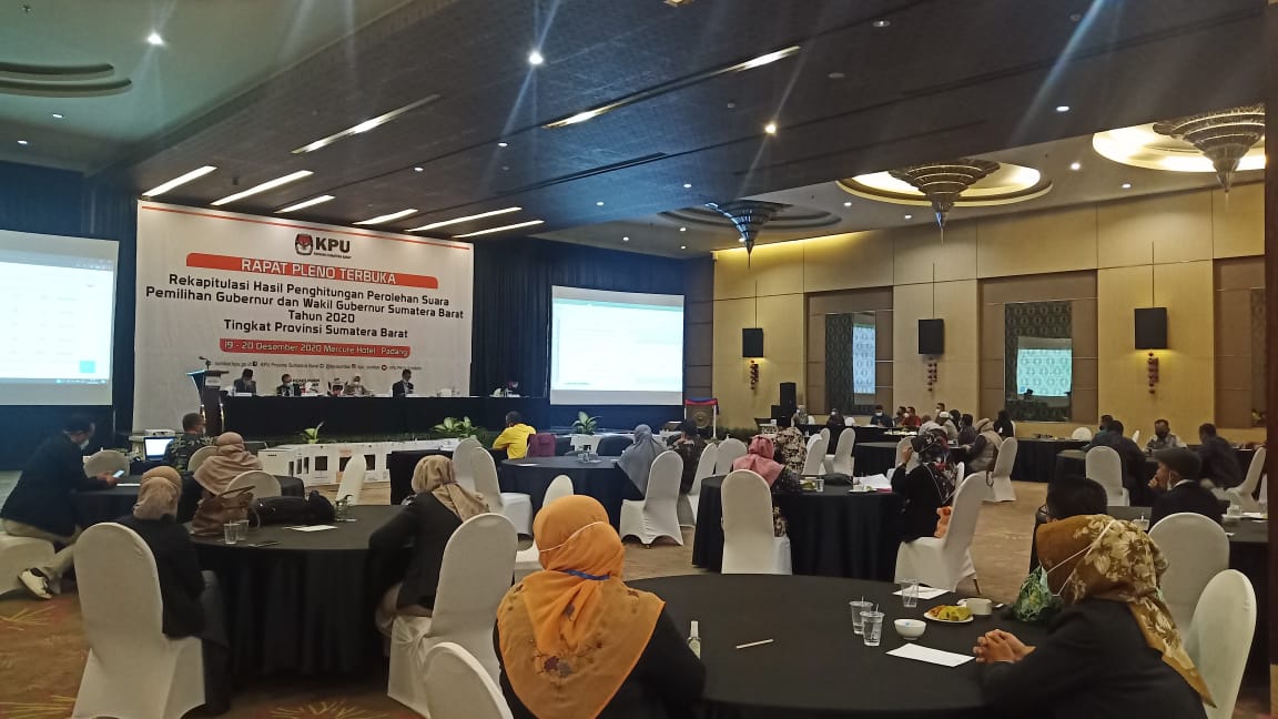 Langgam.id-Komisi Pemilihan Umum (KPU) Sumatra Barat (Sumbar) menggelar rapat pleno terbuka rekapitulasi hasil penghitungan perolehan suara pemilihan gubernur dan wakil gubernur 2020. Rekapitulasi dilaksanakan di Hotel Mecure, Padang, Sabtu (19/12/2020).