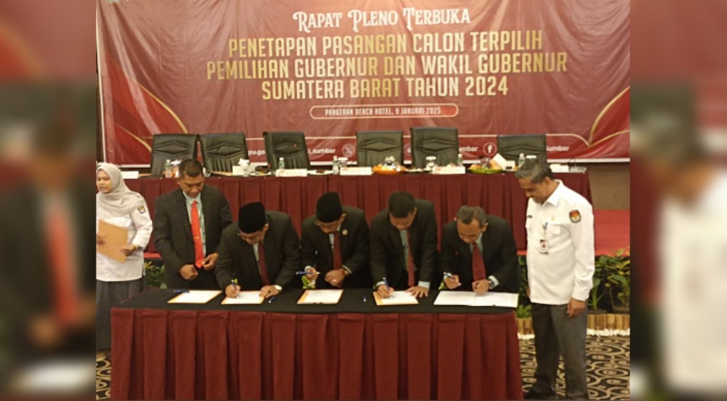 Langgam.id – Pasangan calon (paslon) gubernur dan wakil gubernur terpilih pada Pilkada serentak 2024 resmi ditetapkan oleh KPU Sumbar pada rapat pleno terbuka. Penetapan tersebut diselengarakan di Hotel Pangeran Beach, Kamis (9/1/2025).