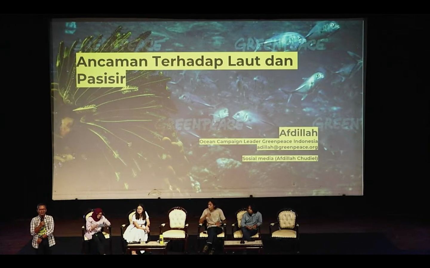 Ocean Campaign Leader Greenpeace Indonesia, Afdillah Chudiel (kiri), berbicara di acara Green Press Community yang berlangsung di Gedung Pusat Perfilman Usmar Ismail, Jakarta, Kamis (9/11/2023).