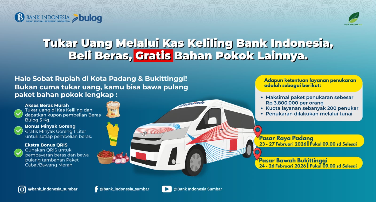 “Program ini dilaksanakan di dua lokasi, yakni di Pasar Raya Padang pada 23–27 Februari 2026 mulai pukul 09.00 WIB hingga selesai, serta di Pasar Bawah Bukittinggi pada 24–26 Februari 2026 pada waktu yang sama,” kata Kepala Bulog Sumbar, R. Darma Wijaya.