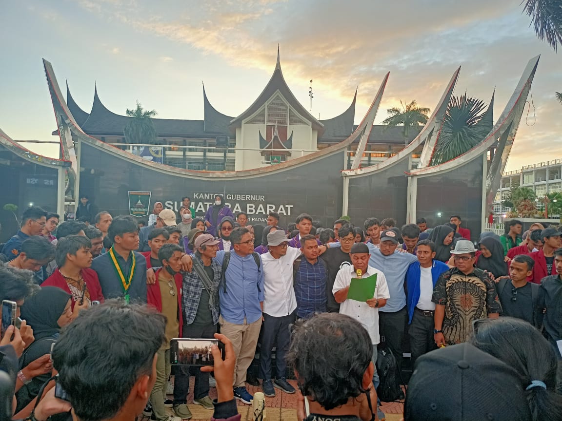 Langgam.id – Ratusan akademika dan masyarakat sipil Sumatra Barat melakukan aksi unjuk rasa di depan Kantor Gubernur Sumatra Barat, Jalan Sudirman, Kota Padang, Rabu (20/3/2024). Mereka menggugat penggembosan tata kelola negara, dimana wujudnya hasil Pemilu sekarang.