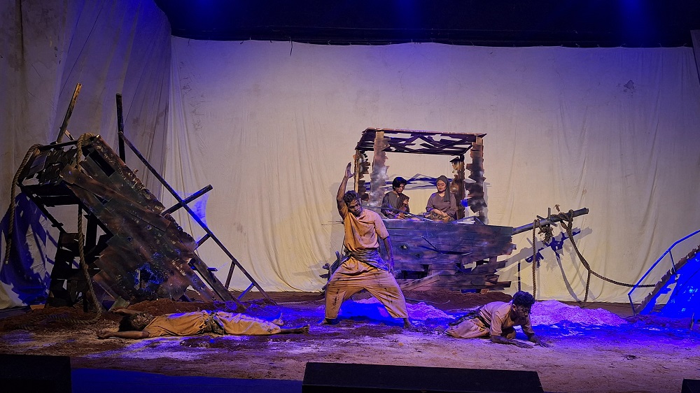 Meskipun berformat menolog, pertunjukan ini melibatkan empat aktor di atas panggung, yang membingungkan penonton awam yang mengira monolog hanya dimainkan oleh satu aktor. Setelah musik dimainkan, terlihat satu aktor yang terbaring di kepingan ujung kapal, sementara tiga aktor lainnya memerankan batu yang diselimuti oleh pasir-pasir laut.