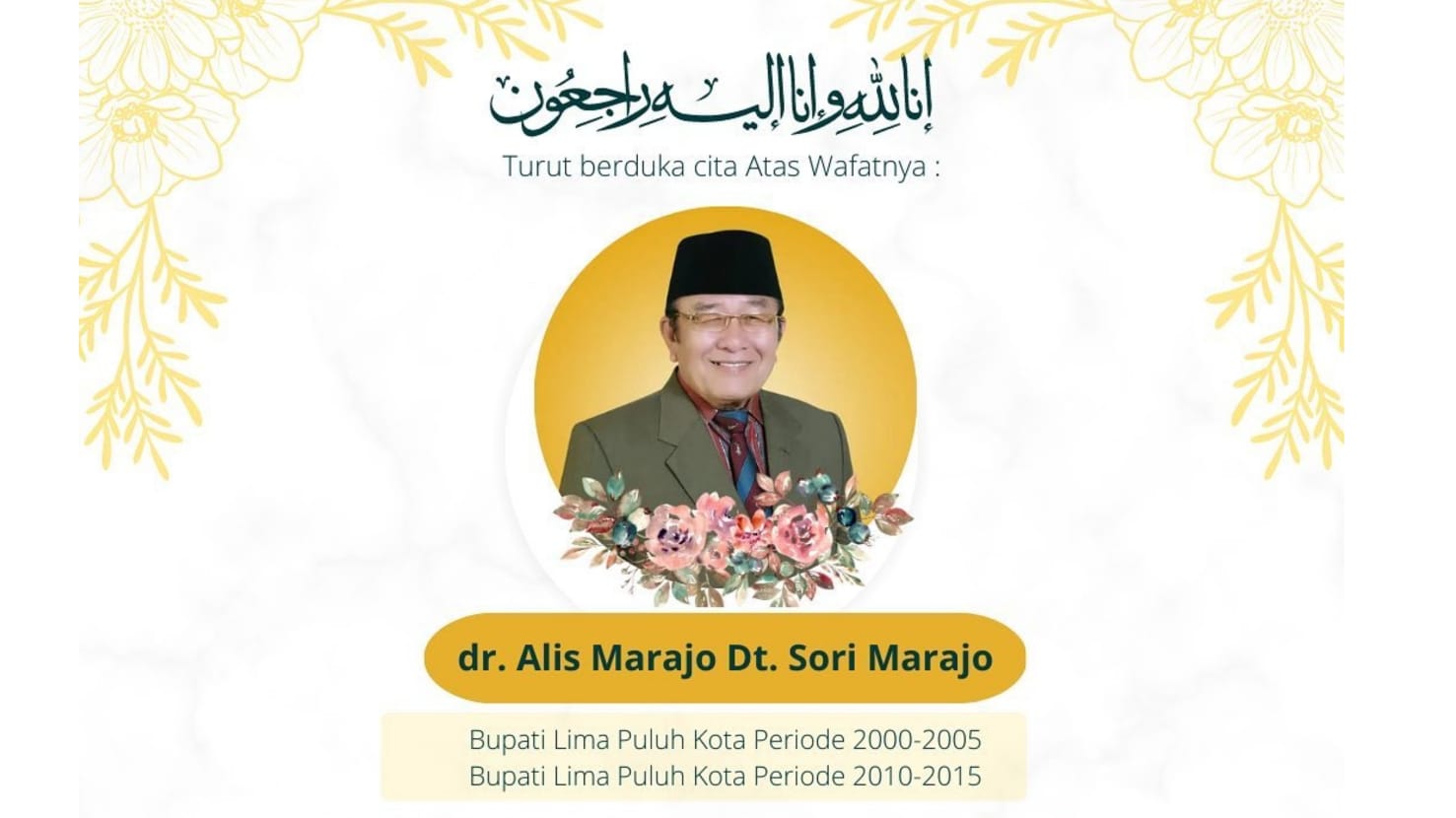 Langgam.id – Mantan Bupati Limapuluh Kota dr. Alis Marajo Datuak Sori Marajo periode 2000-2005 dan 2010-2015 berpulang ke Rahmatullah pada Selasa (28/3/2023) malam.